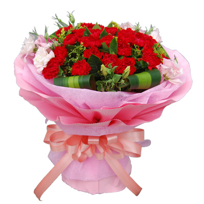 鲜花:50枝粉色康乃馨紧密束扎,粉色勿忘我边缘点缀,绿叶叶丰满外围